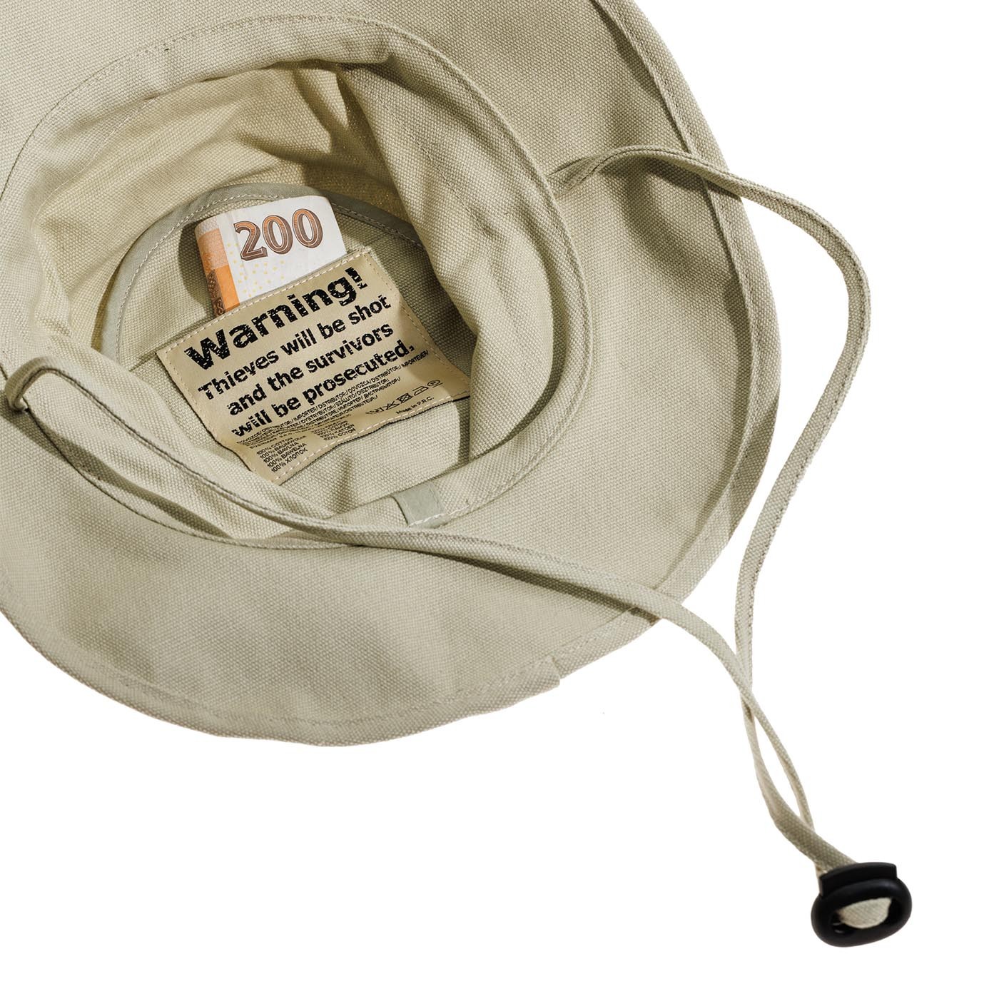 The best is hidden inside. Velcro pocket, in which you can safely store, for example, money, when you just wander along the beach in a swimsuit and hat. The inscription on the pocket is a funny reminder of a time when the thieving hadn't paid off not in the least.