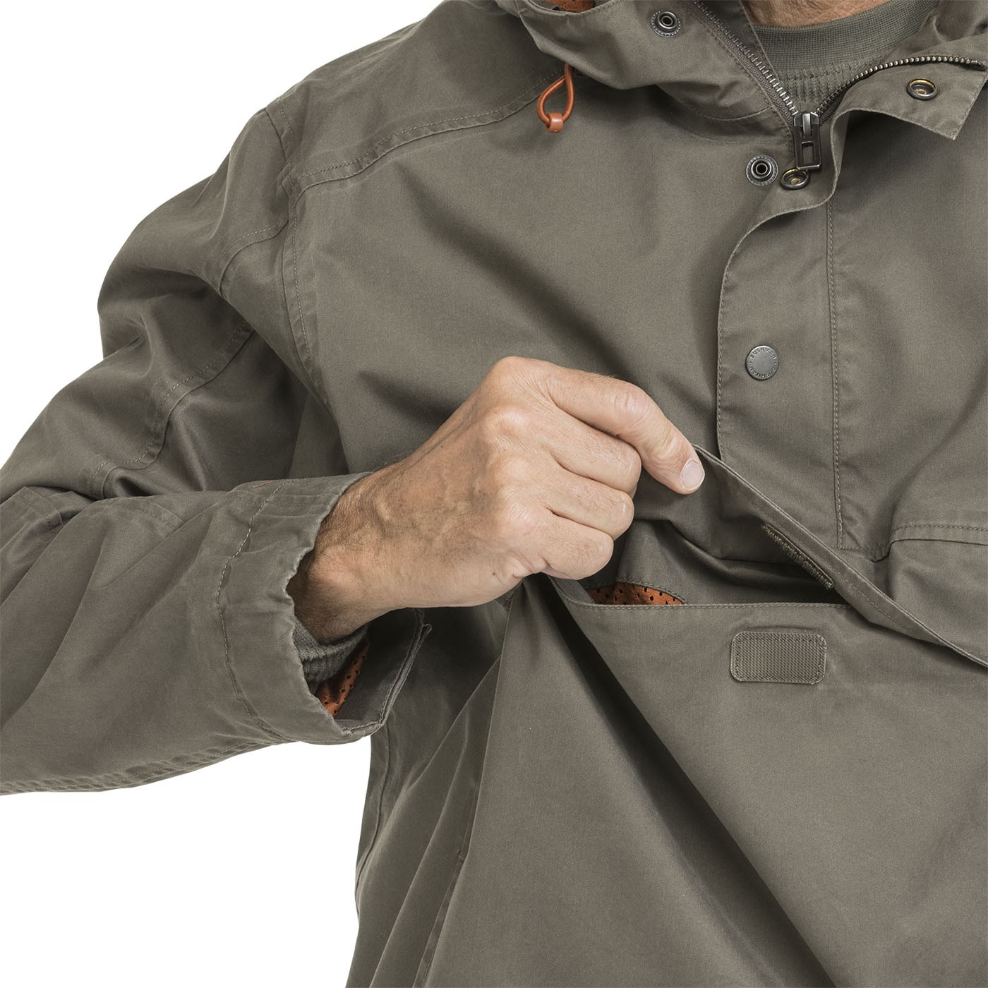 A durable jacket for all terrain, and especially for bad weather! It is made of strong twill (70% cotton, 30% polyester) with a laminated membrane and taped seams, making it both waterproof and breathable. It's worn over the head, fastens with metal snaps and has a practical slit on the left side - for easier dressing and better ventilation. You can pull the hood down with a string, the collar is protected by a zipper stand and buttons. You can easily adjust the hem and sleeves thanks to the elastic cuffs and drawstring. There are also two spacious pockets in the front and one on the stomach fastened with Velcro. A contrasting orange print on the front makes it clear who the weather is with. Specification: Water column: 11,000 mm Breathability: Ret 2.5 m²•Pa/W Weight: 165 g/m²