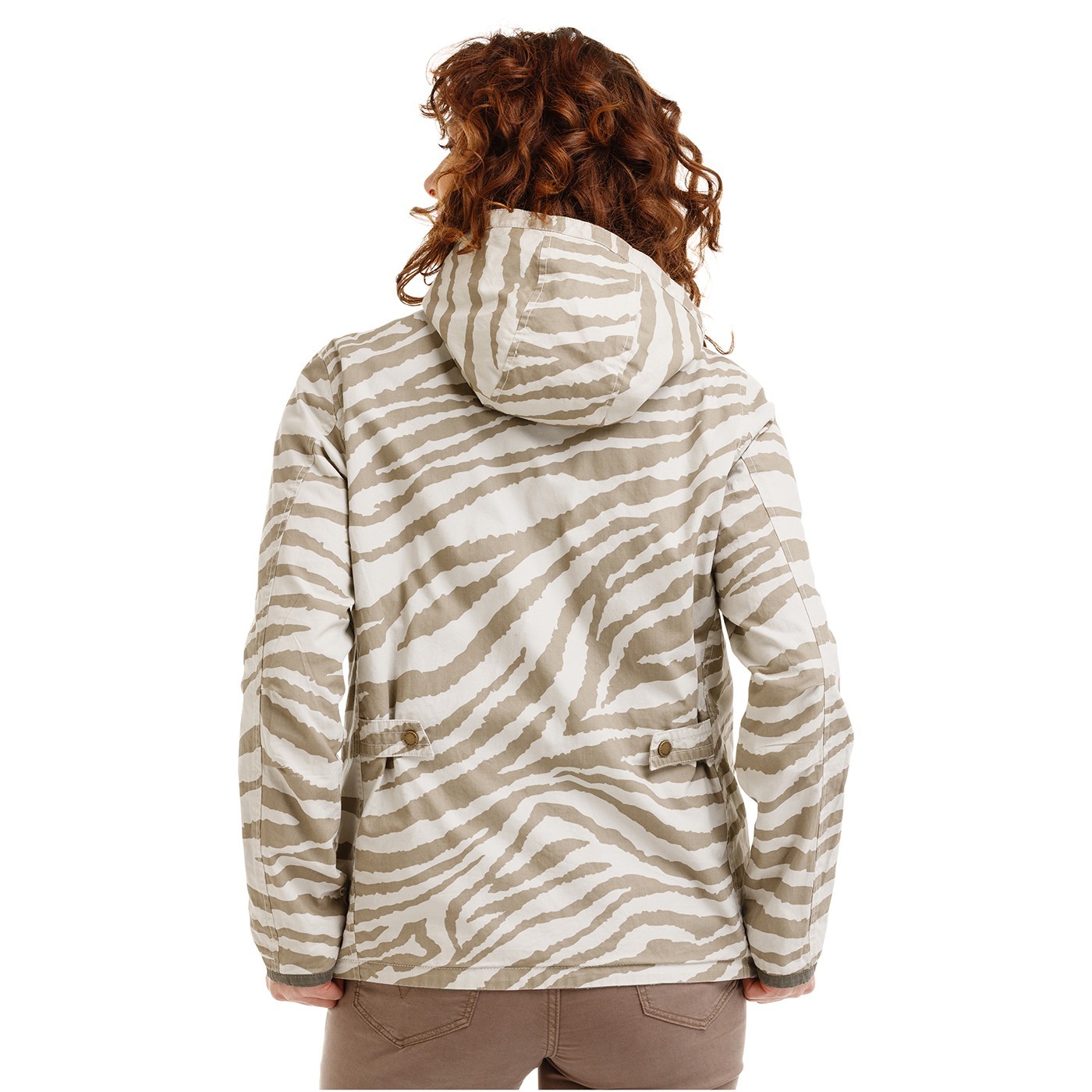 JATENGA is a women's reversible jacket (khaki/zebra pattern) made of strong cotton in twill weave. The detachable zipped hood is complemented by branded press studs on the sides. The size at the waist can be adjusted thanks to the adjustment with the press studs and the folds in the elbow area ensure freedom of movement. The side pockets can be conveniently fastened with hidden studs, while the hanging loop is a small practical detail. The high-quality YKK metal zip guarantees a long service life.