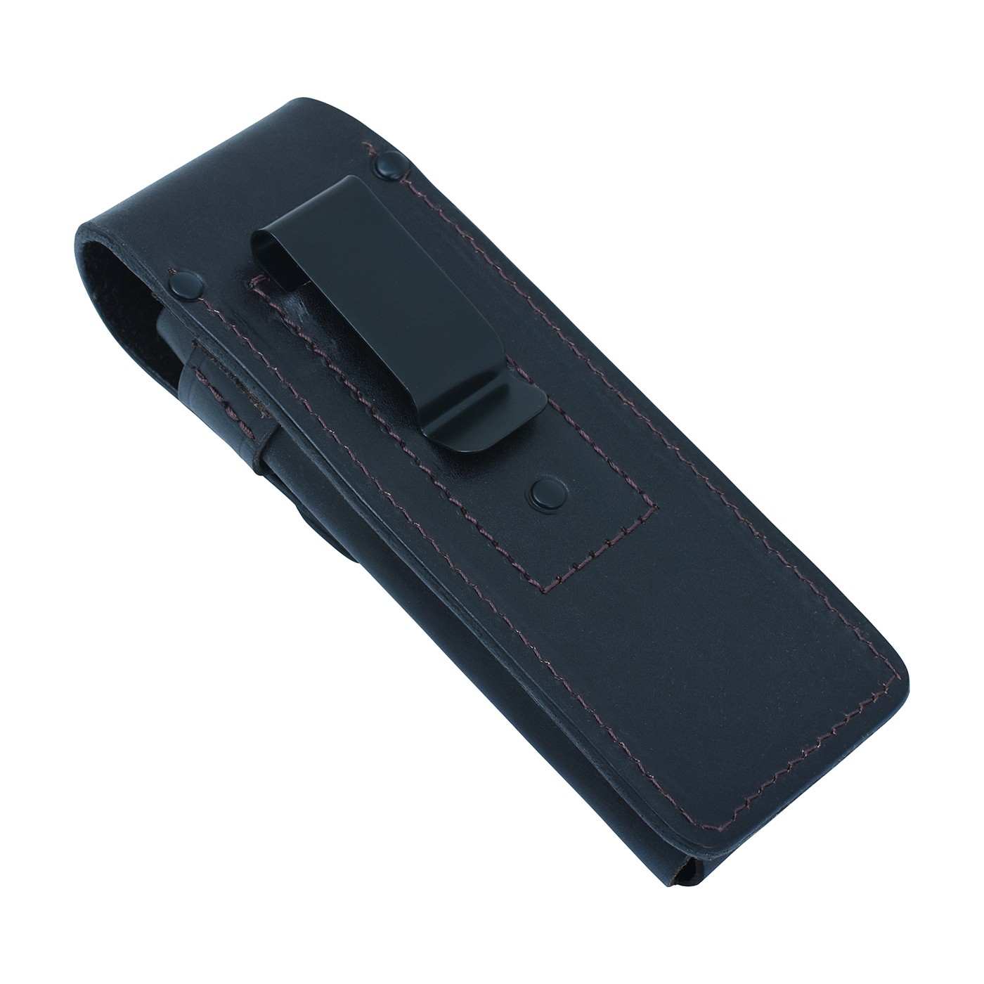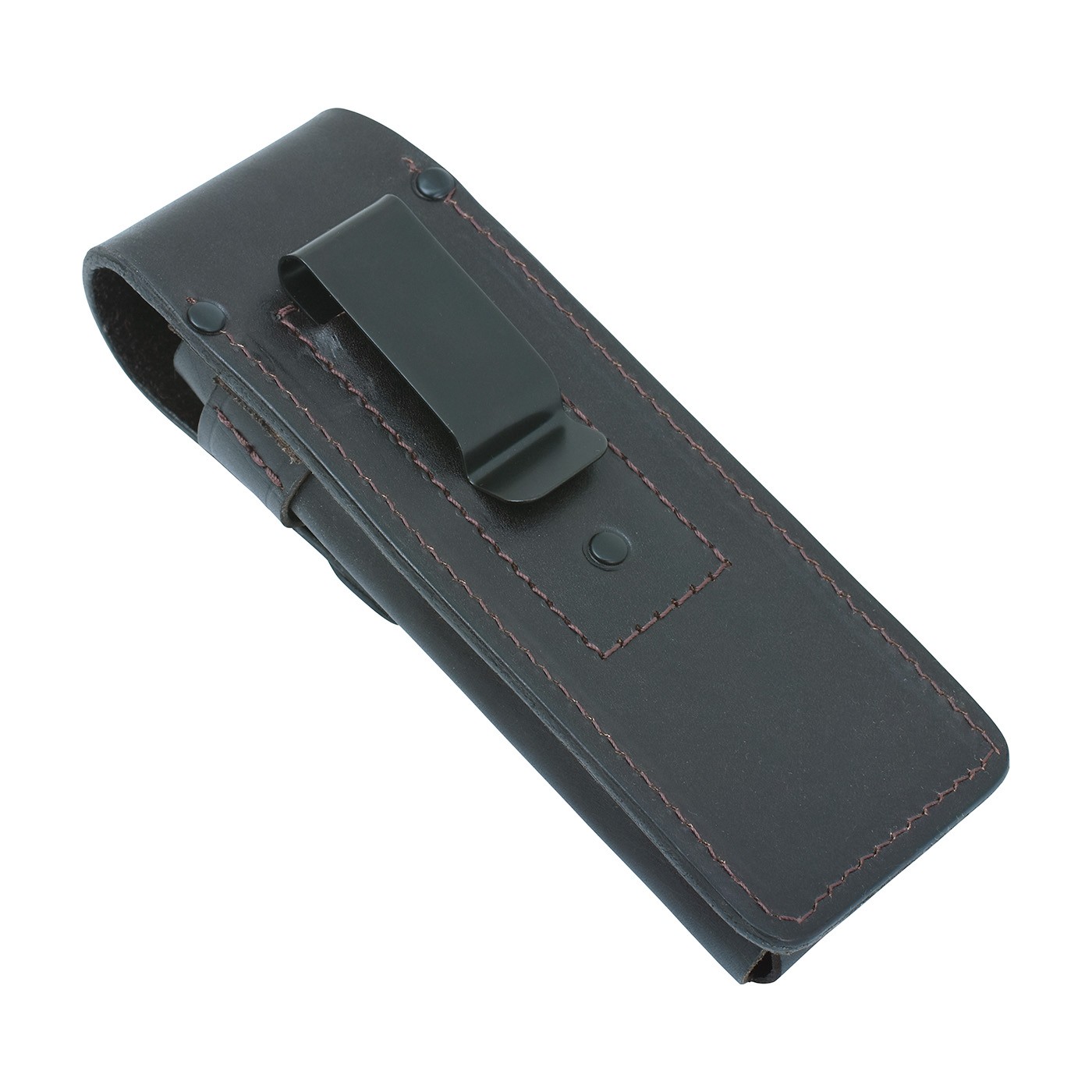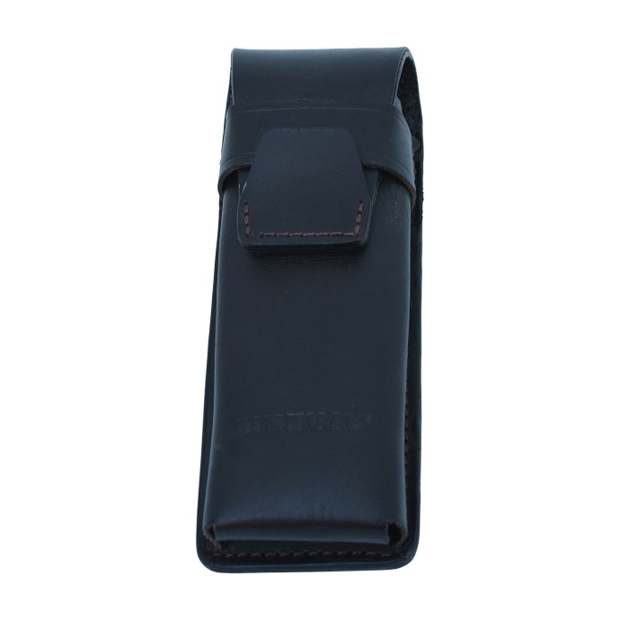 TARANAKI leather sheath made of cowhide leather designed for safe knife storage. The top flap is equipped with a safety lock to prevent accidental opening. There is a metal clip on the back for attaching to a belt. The BUSHMAN logo is embossed on the lower front part. Dimensions: 6 × 16 × 4.5 cms.