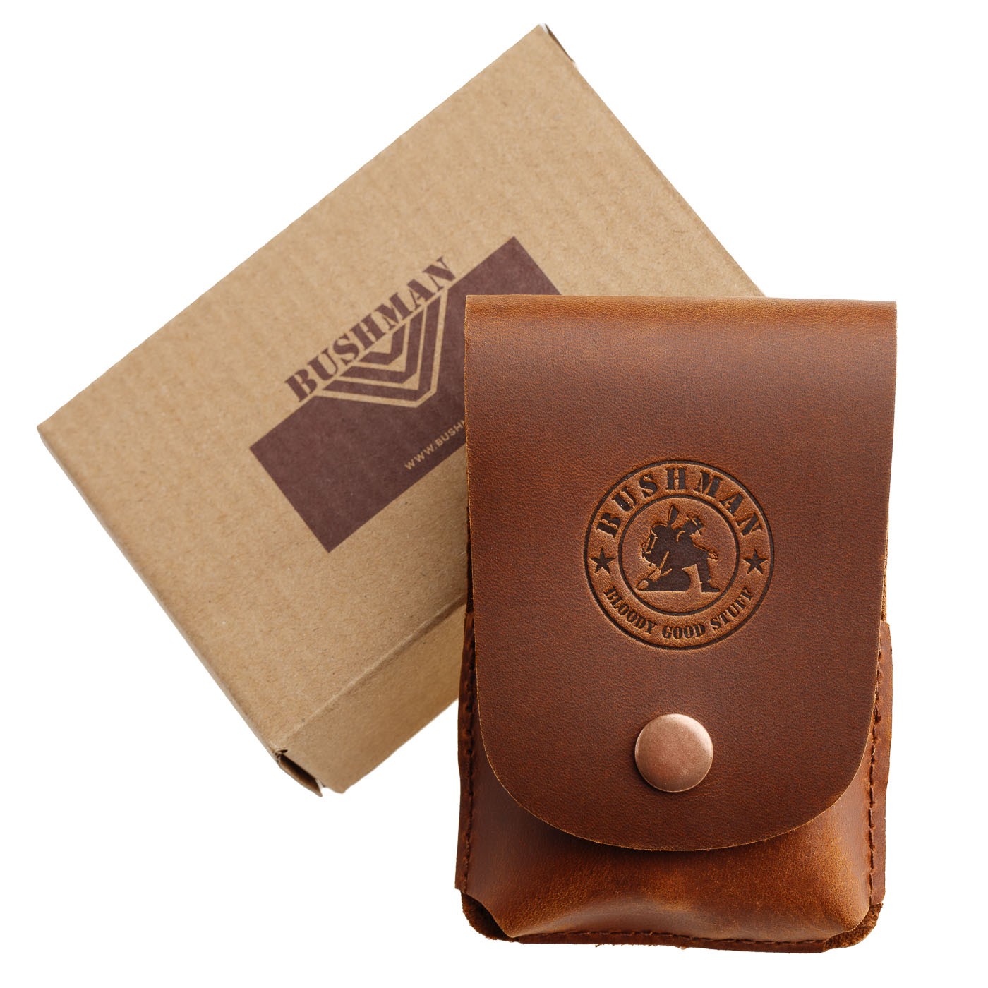 All tools are stored in a dark brown leather case with a brass snap and a discreet embossed BUSHMAN logo.