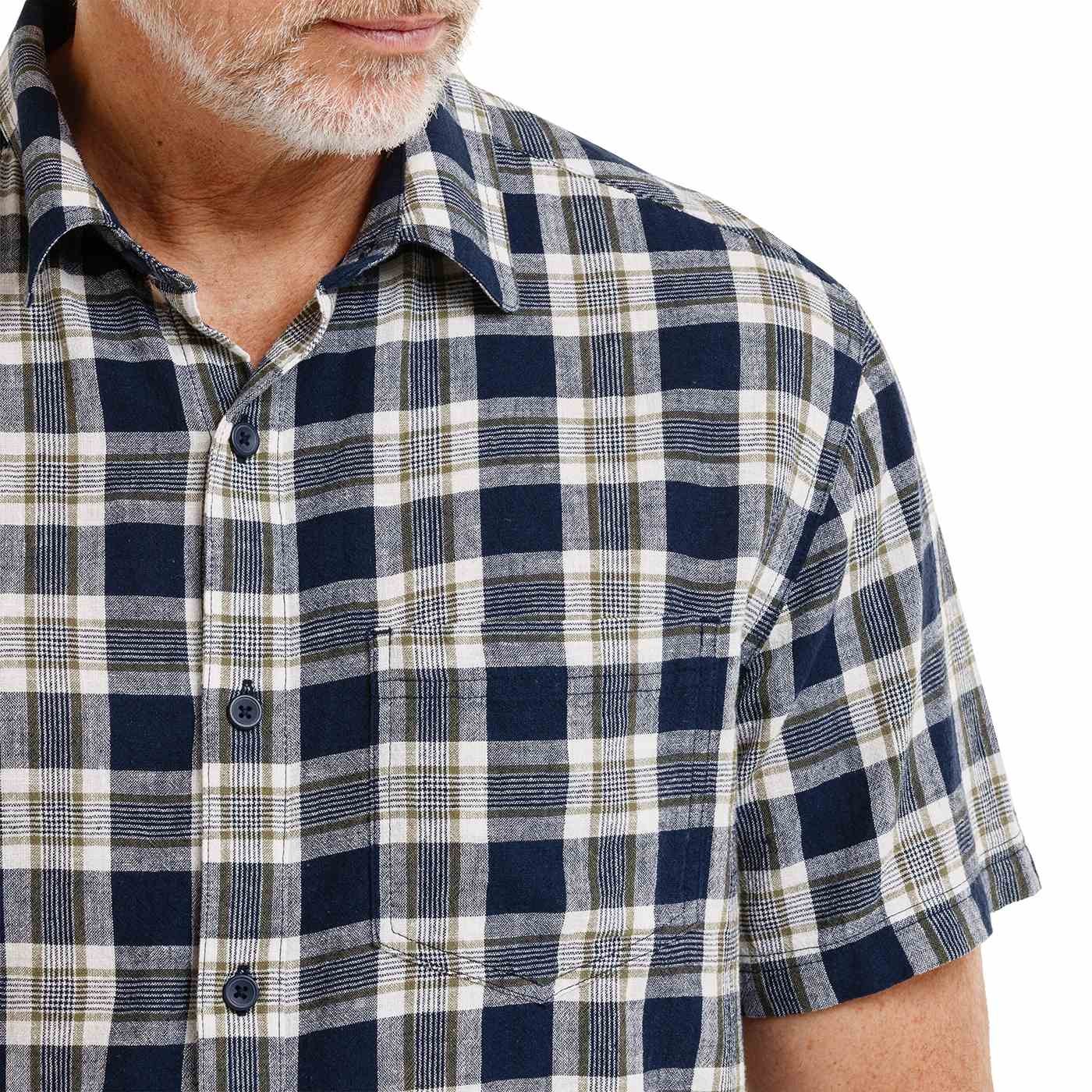 Our KWAME shirt is made of a lightweight cotton-linen blend, which ensures breathability and a pleasant feeling even on hot days. It has short sleeves, a straight narrower fit and a clean design. Not a single breast pocket is missing. A decent metal label on the rear saddle.