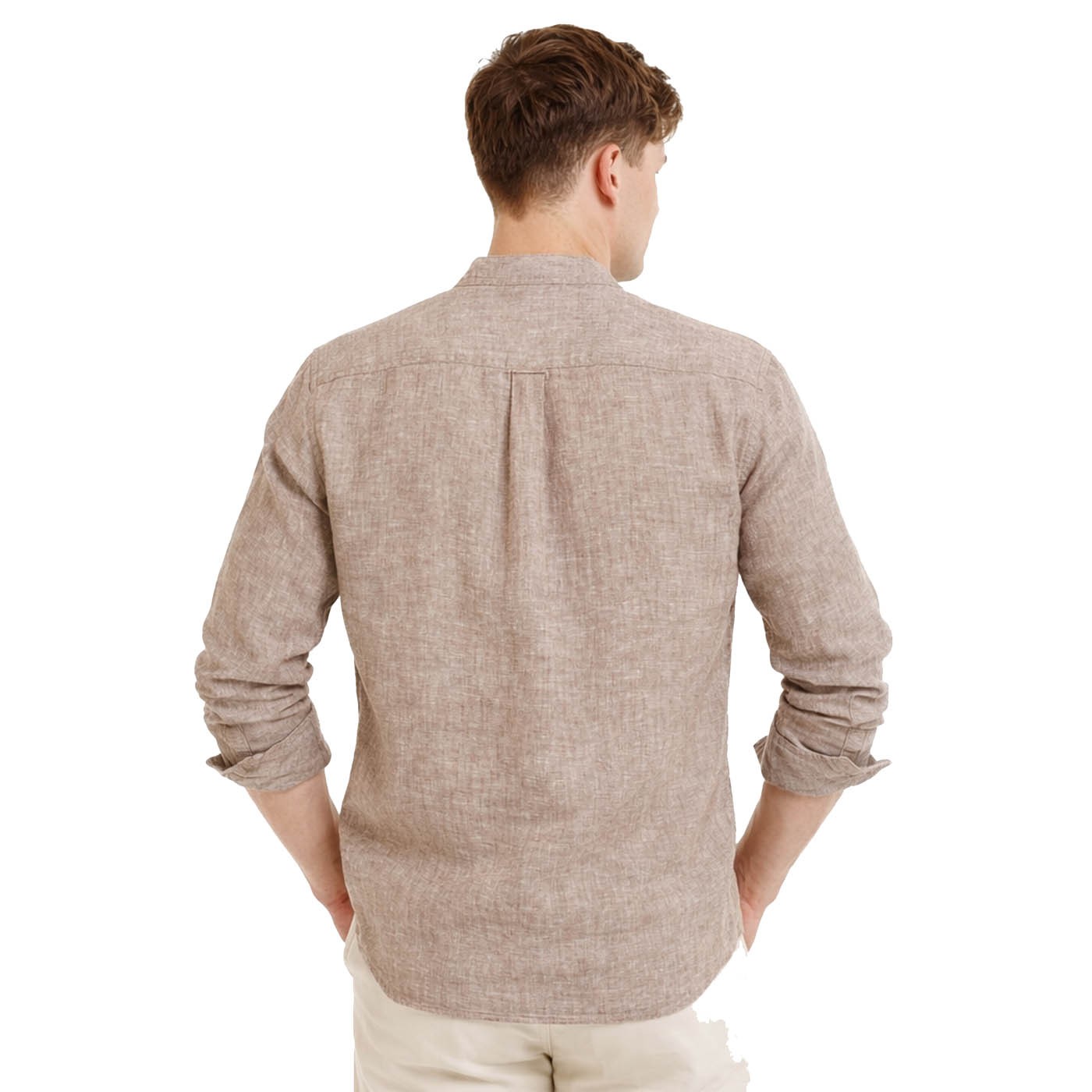 The SITAN shirt is made of 100% linen in a light Y/D chambray finish with a finely mottled effect. It has long sleeves, collarless neck fastening (stand-up collar), a looser cut and practical folds at the back for freedom of movement. There are two chest pockets with button flaps. Classic shirt cuffs, a contoured hem and a brand flag located in the side seam complete the functional and natural look.