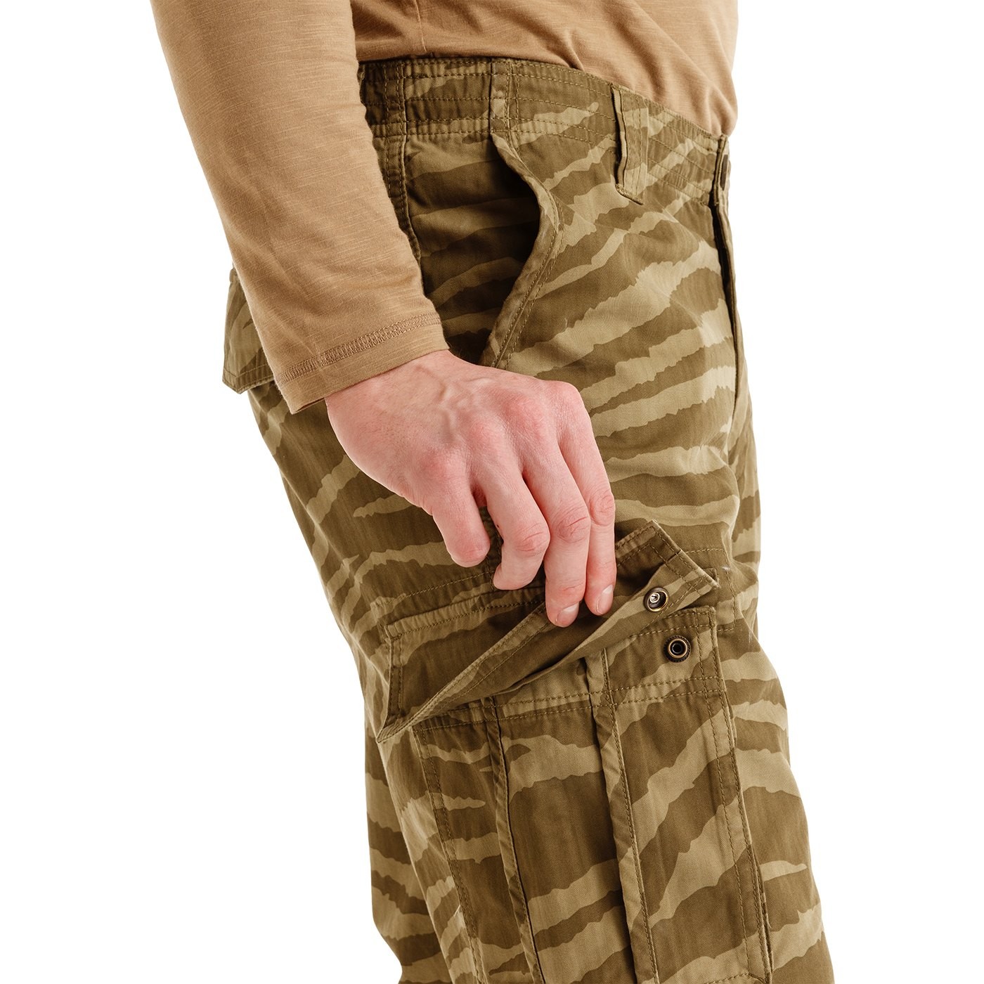 TUY are shorts inspired by the terrain, designed for guys who are not afraid of a more distinctive look and at the same time want a functional solution. The camouflage zebra pattern gives the shorts an expeditionary character, while the strong cotton fabric with a specific weave (broken twill) ensures durability in everyday wear even in more demanding conditions. Cargo pockets on the sides provide plenty of space and stay organized thanks to the flaps with hidden fastenings. The inner laces allow you to fine-tune the waist circumference as needed. Brand elements are used sparingly, but clearly –TUY are shorts that have an expression, solid function and a Bushman identity.