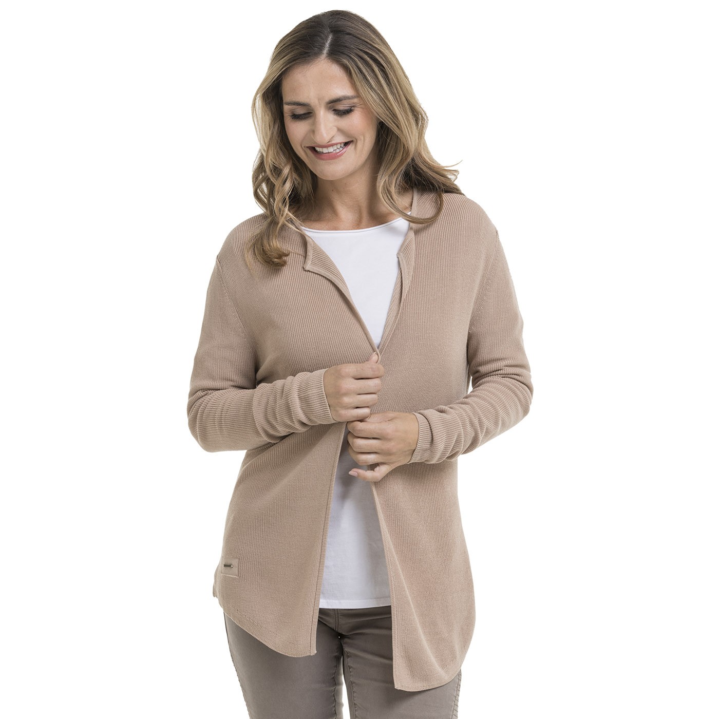 This piece combines the comfort of its selected materials with its understated elegance. This sweater in the cut of a shorter jacket is knitted from a luxurious blend (TENCEL™ Lyocell 70%, cotton 25% and silk 5%), so it has a light sheen, is soft to the touch and blends perfectly. The tie at the waist accentuates the silhouette and the elongated front part adds a casual touch. Elegant but still true to Nature - just the way we like it. Specification: Machine knitted, division 12 GG