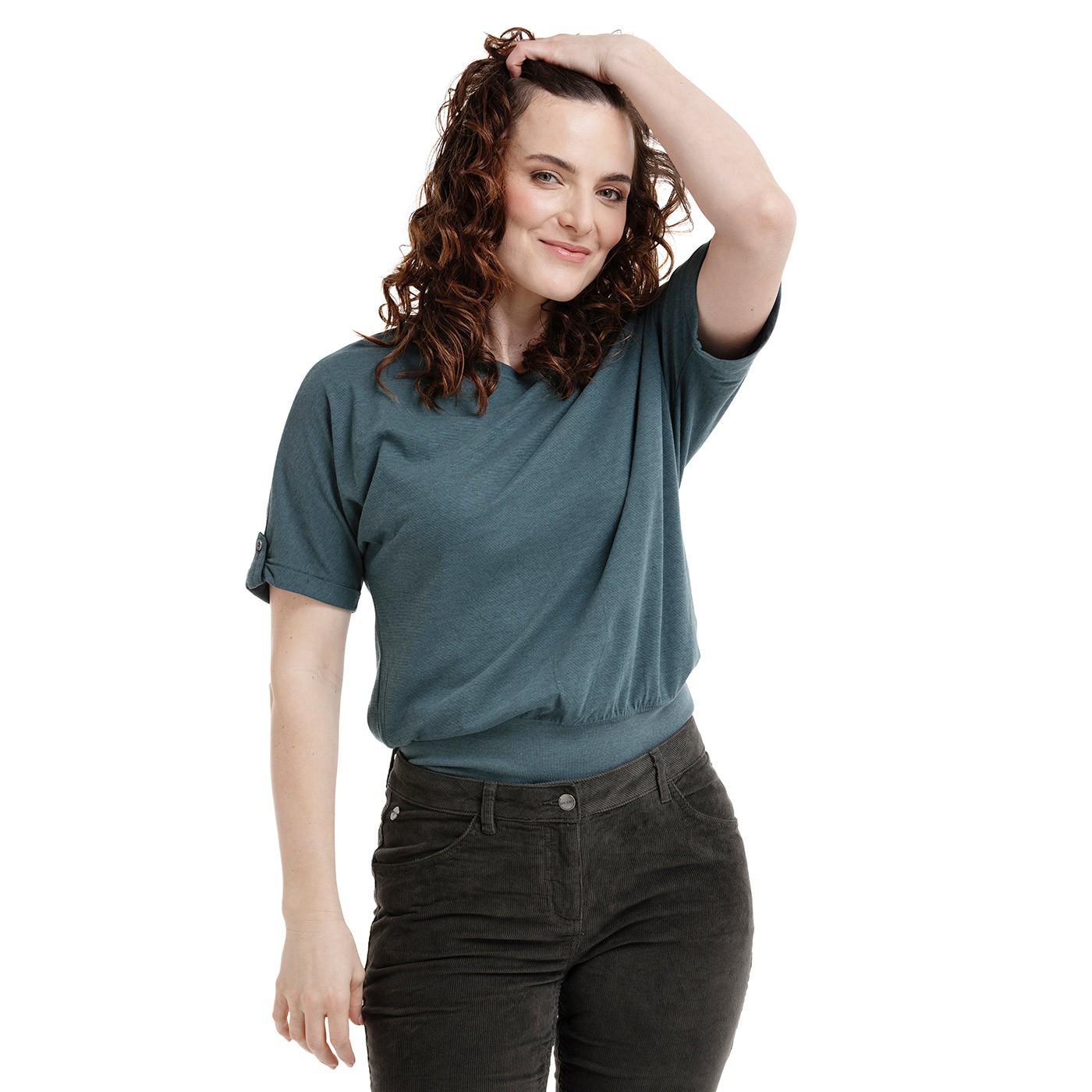 The lightweight GARRA II women's T-shirt in a blend of cotton (50%) and ECOVERO™ viscose (50%) is heavenly soft. It has a loose, flowing fit and is enhanced by dropped sleeves with a button placket and a tiny metal label on the back. Weight: 160 g/m2, alternative knit. Softened by washing, no printing.