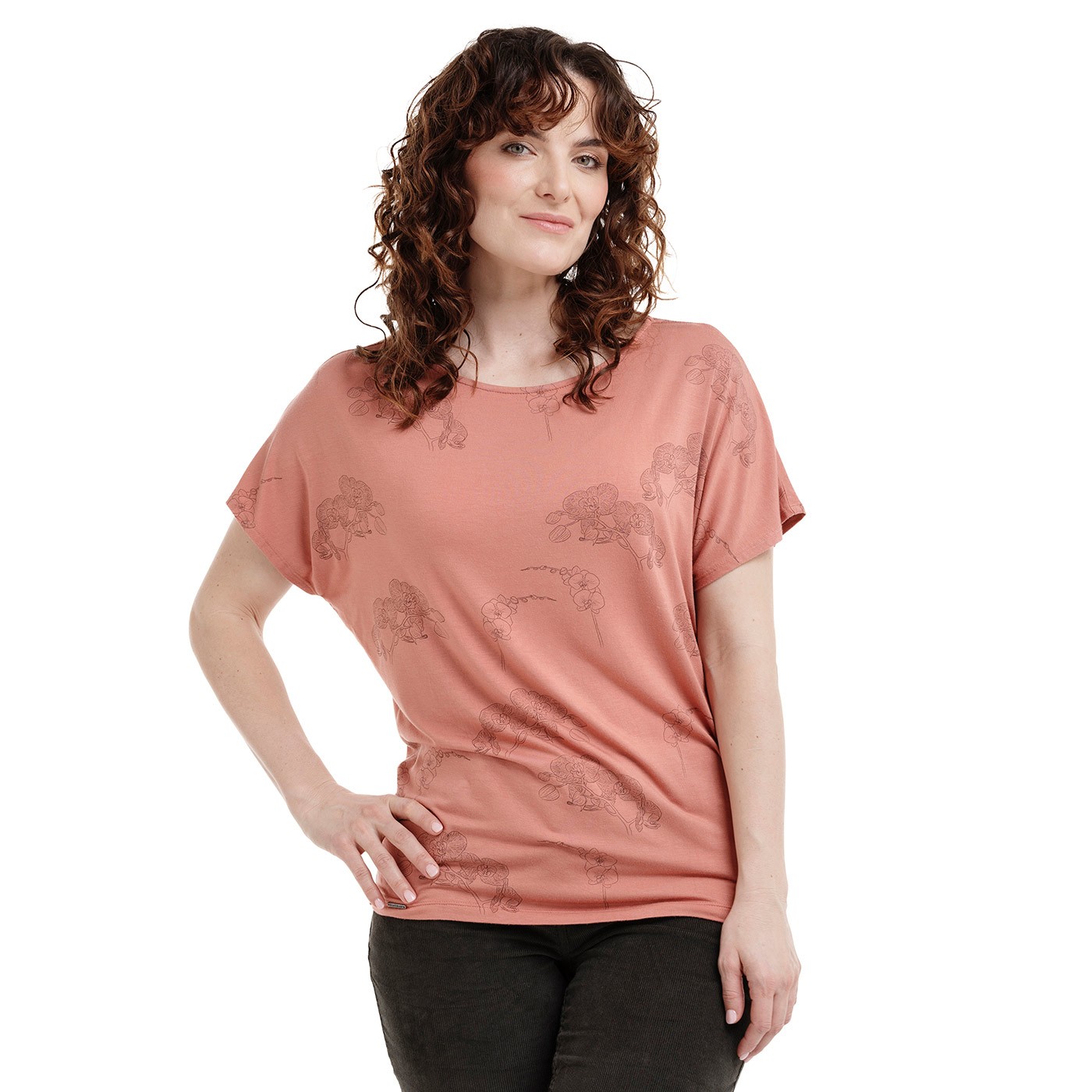 The lightweight and soft GOA T-shirt with 94% modal (TENCEL™ ) and 6% elastane has a unique design dominated by an all-over print with a plant motif, as well as unusual dropped sleeves. The T-shirt is truly unique, comfortable against the skin and with a specific sheen. Weight: 210 g/m2, single knit, bio polish wash.