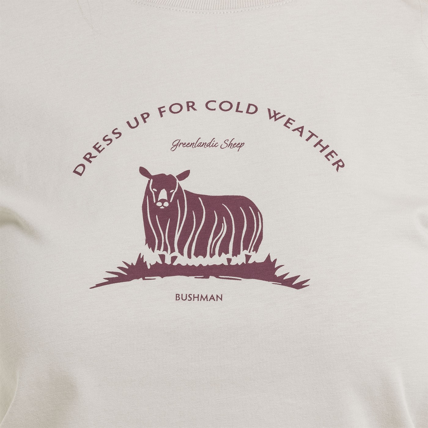 A beige T-shirt with a picture of a Greenland sheep and the slogan "Dressed up for cold weather" will give you style and fun. Soft cotton, a comfortable fit and a touch of humour - this is the perfect combination for layering or for a lighter outfit.
