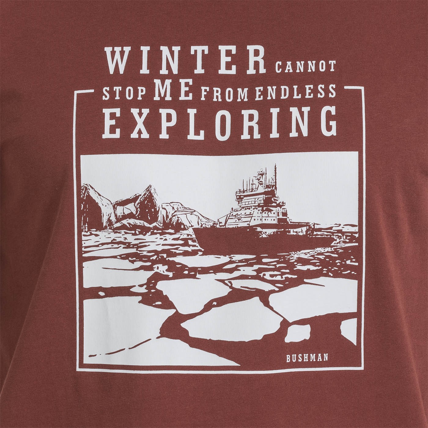 Ice, wind, snow? Excuses! This T-shirt with its icebreaker print and the slogan "Winter cannot stop me from endless exploring" is a clear message that your travels do not end under any circumstances. Classic basic cut, 100% cotton, high-quality single-faced knit and a final treatment of bio polish wash for a softness that you will love the first time. On the chest of history, on the body of comfort. Specification: Composition 100% cotton, Weight: 200 g/m²