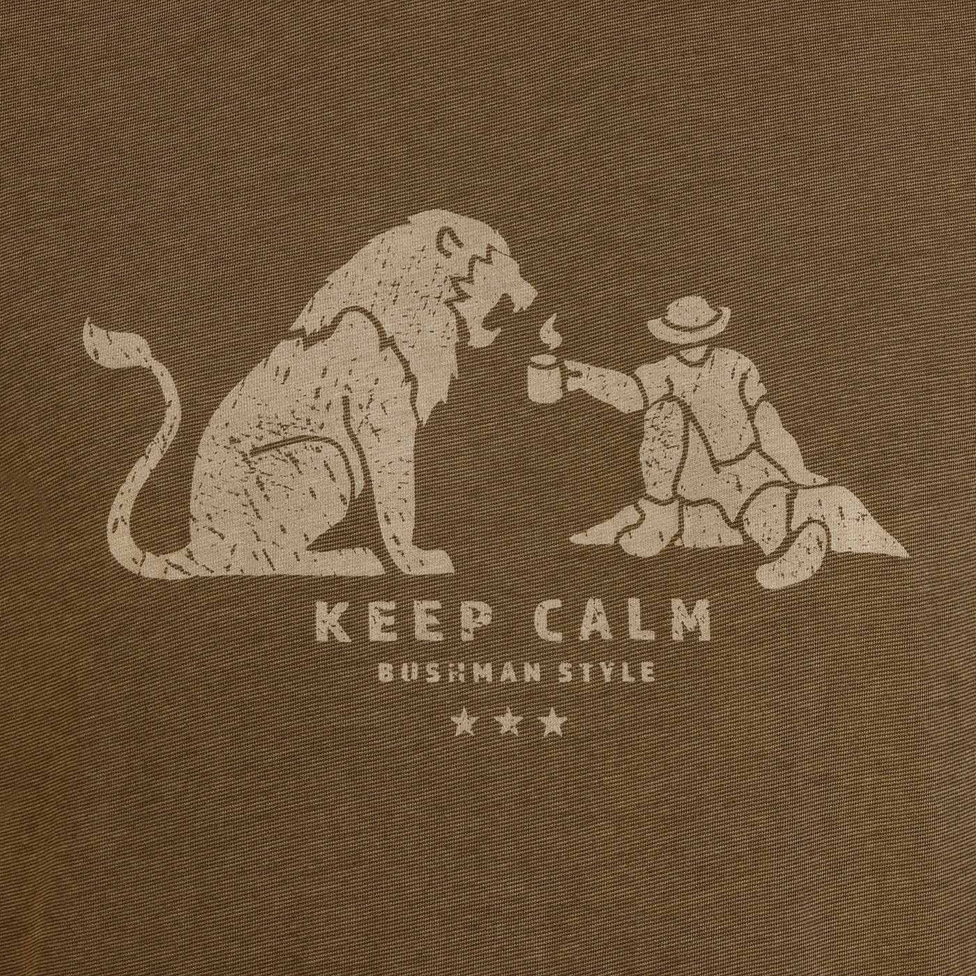 LASAL is a versatile summer T-shirt that combines comfort, lightness and an attitude! The soft blend of cotton and viscose ECO VERO™ is pleasant to the touch, breathable and adapts well to the body. The straight narrower cut fits perfectly, and the short sleeves are also suitable for layering. The "Keep calm, Bushman style" print with a Bushman and lion motif when camping together brings a playful view of adventure and peace in the wilderness. The brand print on the back discreetly completes this authentic BUSHMAN sigcolour piece.