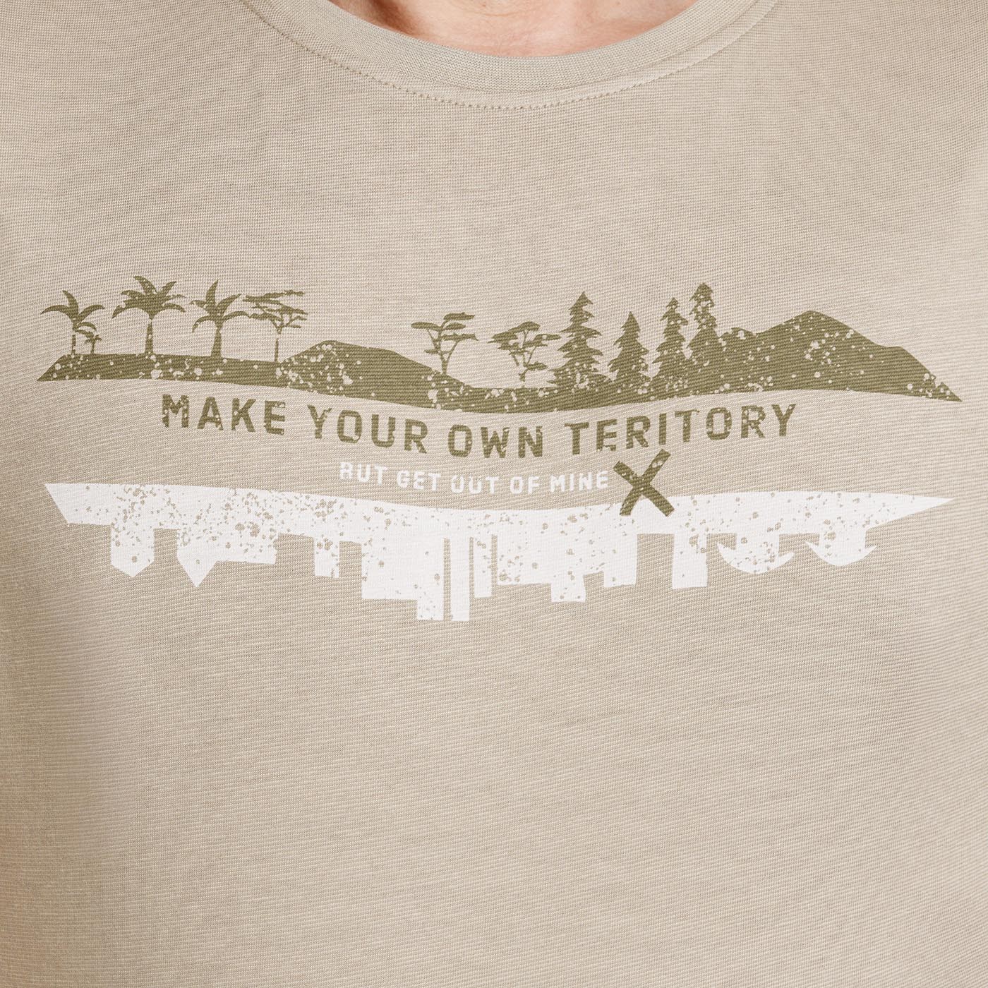LASAL is a versatile summer T-shirt that combines comfort, lightness and charm. The soft blend of cotton and viscose ECO VERO™ is pleasant to the touch, breathable and adapts well to the body. The straight narrower cut fits perfectly, and the short sleeves are also suitable for layering. The "Make Your Own Territory" print with the motif of the mountain horizon turning into a reflection of the city symbolizes the freedom of choice between Colour and civilization. The back brand print subtly underlines the Bushman philosophy of independence.