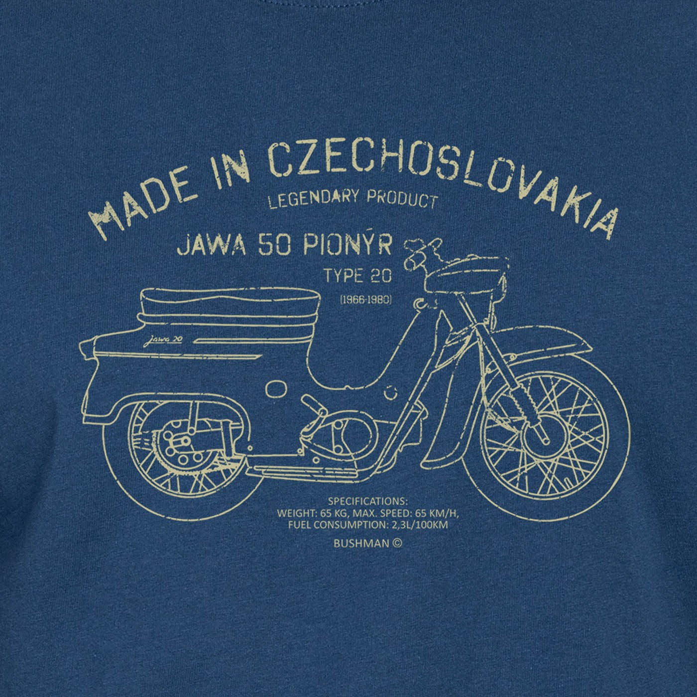 We appreciate products that have conquered the world or the hearts of past generations. For example, the "Fichtl" or "Pincek," type 20 with rev plates or 21 Sport. Many generations grew up on this motorcycle manufactured in Považské Strojírny. Developed in the mid-20th century as a means of transport accessible to the widest possible market, this motorcycle was and remains the ideal machine for learning the principles of a two-stroke engine and for patience training. With a special edition of prints on these short-sleeved cotton T-shirts, BUSHMAN pays tribute to legendary products "made in Czechoslovakia." 100% cotton, 180 g/m2, straight cut.