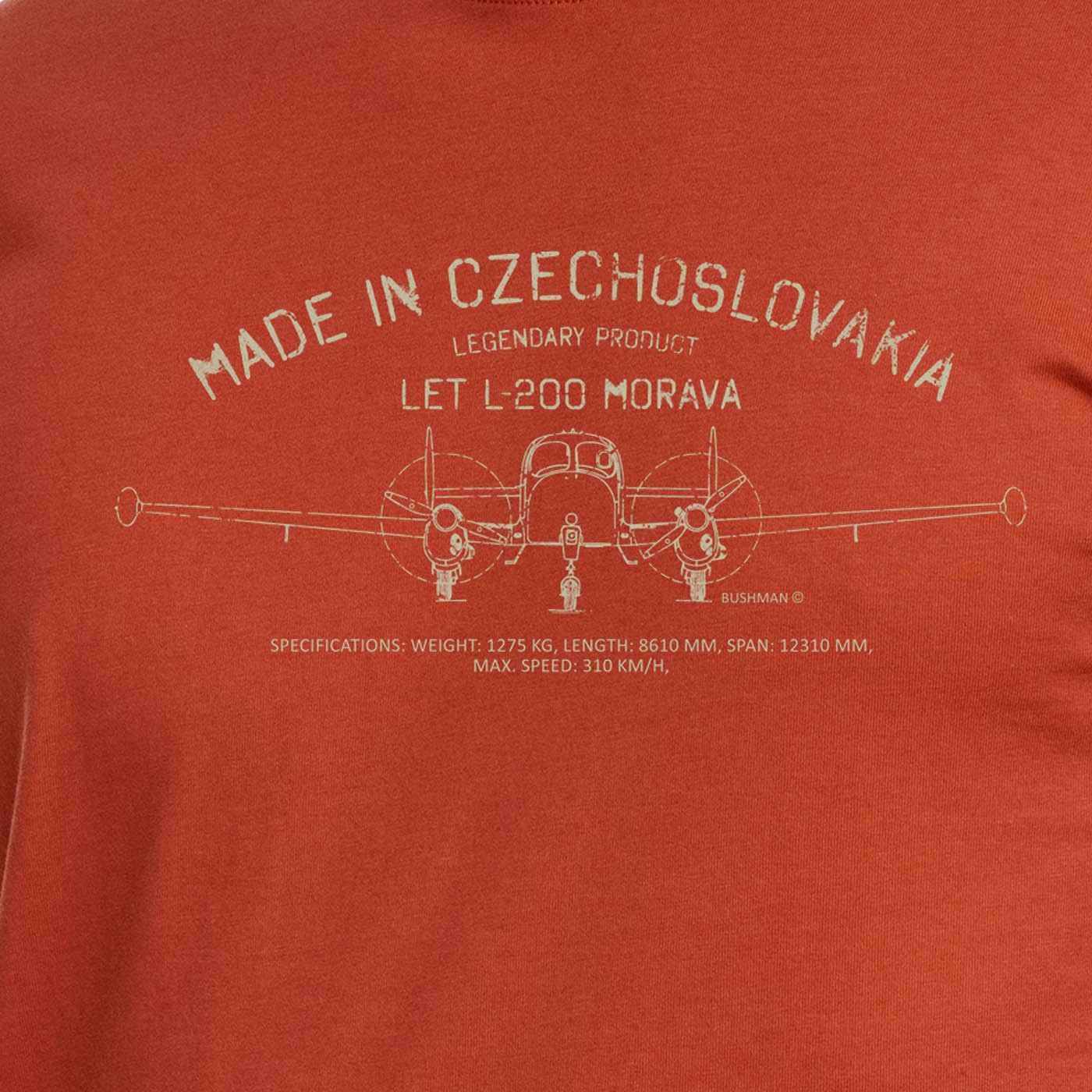 We appreciate things that have conquered the world or the hearts of past generations. It was supposed to become a new air taxi, and its development began at the future Let Kunovice factory in 1955. The twin-engined, self-supporting low-wing Let L-200 Morava for one pilot and three to four passengers is currently used mainly for sightseeing flights due to its popularity and quality. With a special edition of prints on these short-sleeved cotton T-shirts, BUSHMAN pays tribute to legendary products "made in Czechoslovakia." 100% cotton, 180 g/ms2, straight cut.