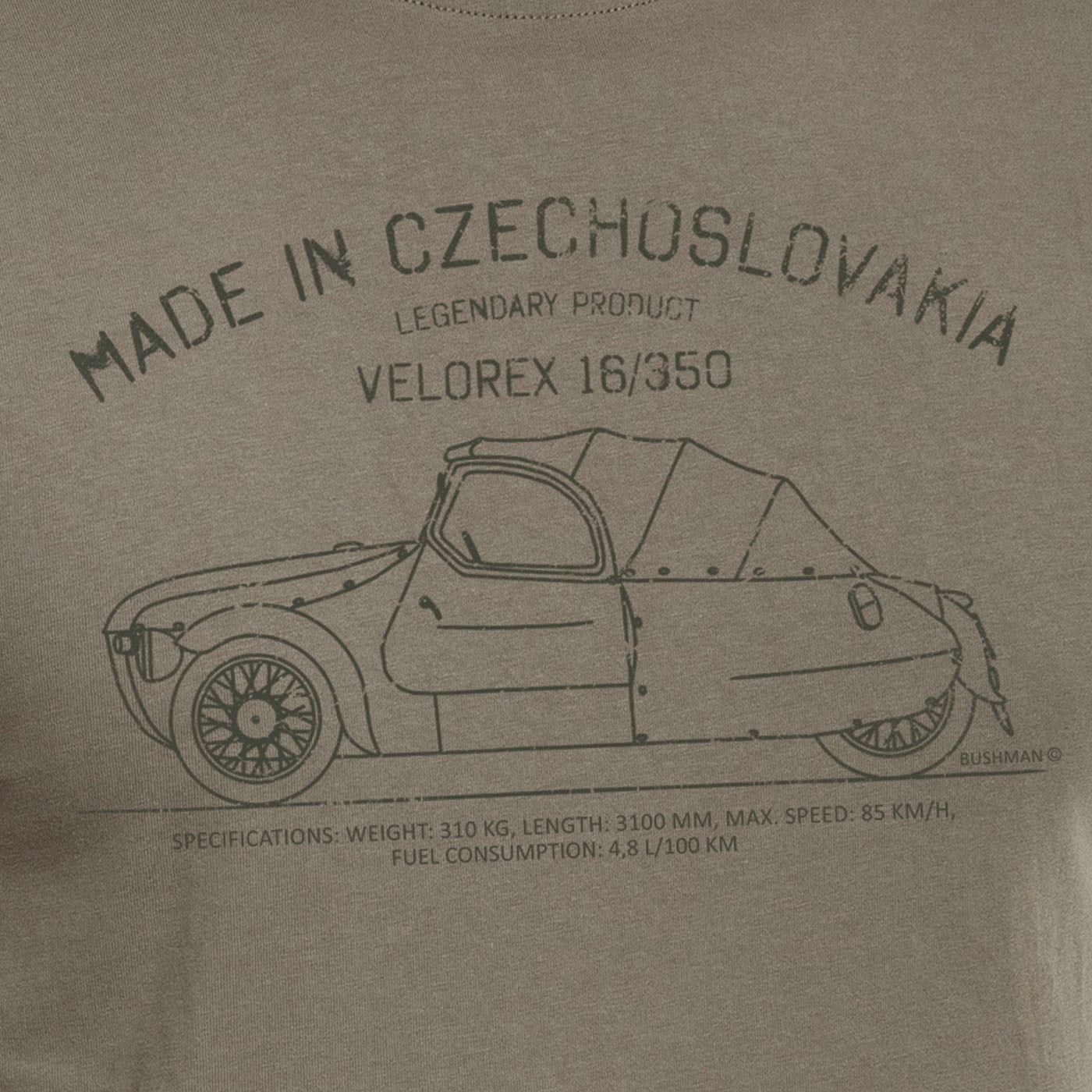 We appreciate things that have conquered the world or the hearts of past generations. Velorex, nicknamed rag, rag plane, goose leg, Montgomery, bat, runaway pipes, or fleeing tent, became the only vehicle with a canvas body to be allowed on public roads in the world. Originally a limited number of tubular frames covered with leatherette by designers FrantiÅ¡ek and MojmÃr Stránský, it was manufactured at the Solnice Velodrome as a vehicle for the disabled and became famous in the Czech film ‚Vrchnà prchni‘. With a special edition of prints on these short-sleeved cotton T-shirts, BUSHMAN pays tribute to legendary products "made in Czechoslovakia." 100% cotton, 180 g/m2, straight cut.