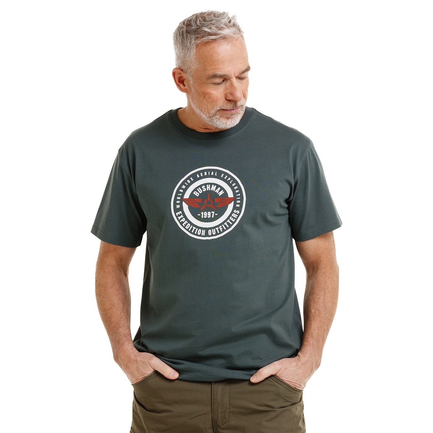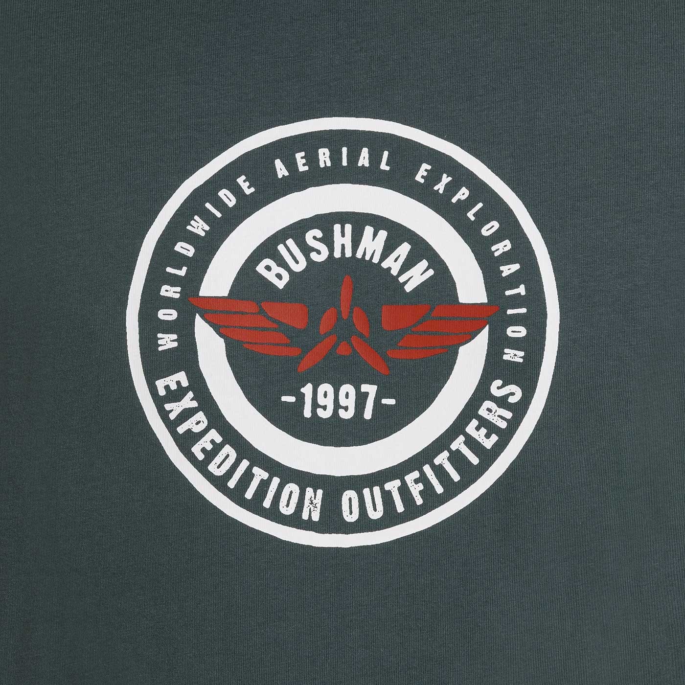 "Expedition Outfitters – Worldwide Aerial Explorations" – The round print with an aircraft icon refers to the aerial exploration programme and symbolizes the desire to discover the world from a new perspective. The motif combines expeditions, travel and the adventure-filled origins of the BUSHMAN slogan.