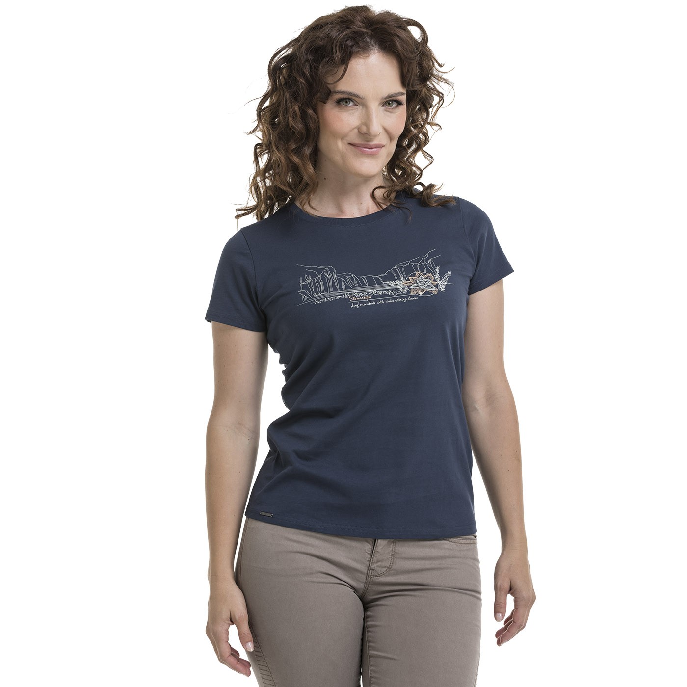 Nature has style - and so do you. A Women's T-shirt made of pure cotton with a delicate plant motif (stonecrops) celebrates the beauty of wild plants that can adapt to even the harshest conditions. Just like you. Classic cut, pleasant surface thanks to the bio polish treatment and fair weight - for every day when you want to feel a connection with Nature. Specification: Composition: 100% cotton, Weight: 200 g/m².
