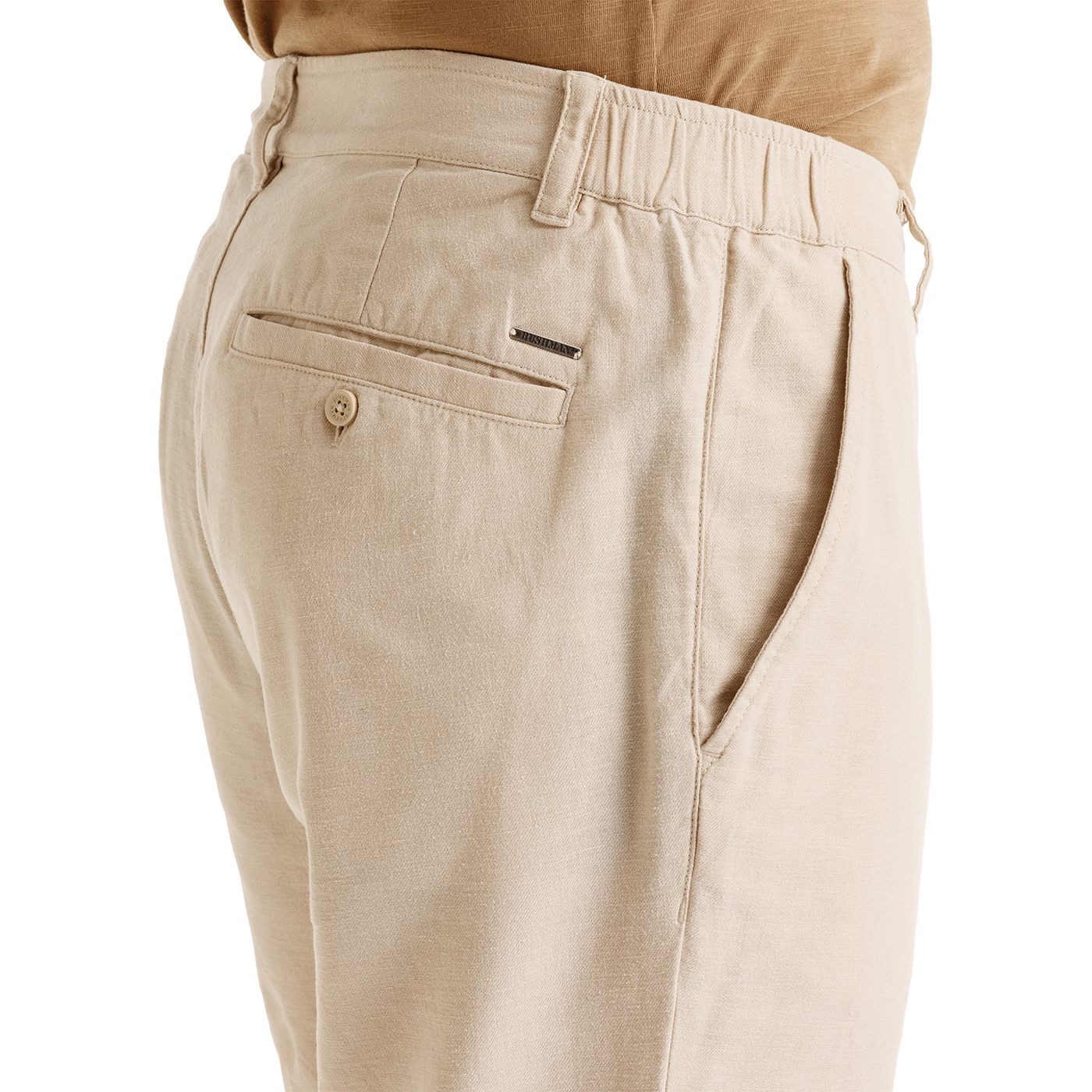 ENITAN are trousers designed for warmer days and a relaxed urban rhythm. The cotton/linen blend breathes naturally, looks light and fresh, making the pants ideal for all-day wear. A looser waist with elastic (also with side adjustment) increases comfort and gives the trousers a casual, yet also urban expression. The clean cut is complemented by fine details — a discreet embroidery on the front pocket, a metal label on the back or the classic button closure of the back pockets. ENITAN are trousers that do not try to impress with their striking appearance, but with honest material, simplicity and balanced style.