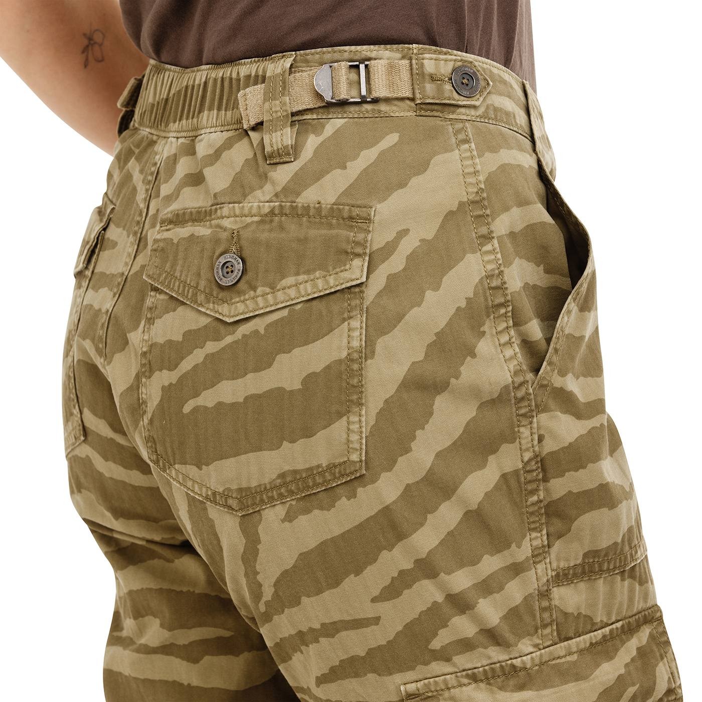 Ribbed pocket trousers combine durability and style in one. The broken twill weave adds strength to the fabric, while the articulated seams and legs shaping, which are elasticated at their bottoms, promote comfortable movement. Practical pockets provide plenty of space for everything you need. A distinctive camouflage pattern will then add flair and an authentic Bushman touch to the whole outfit. Ideal for the city, for outdoor activities and for leisure