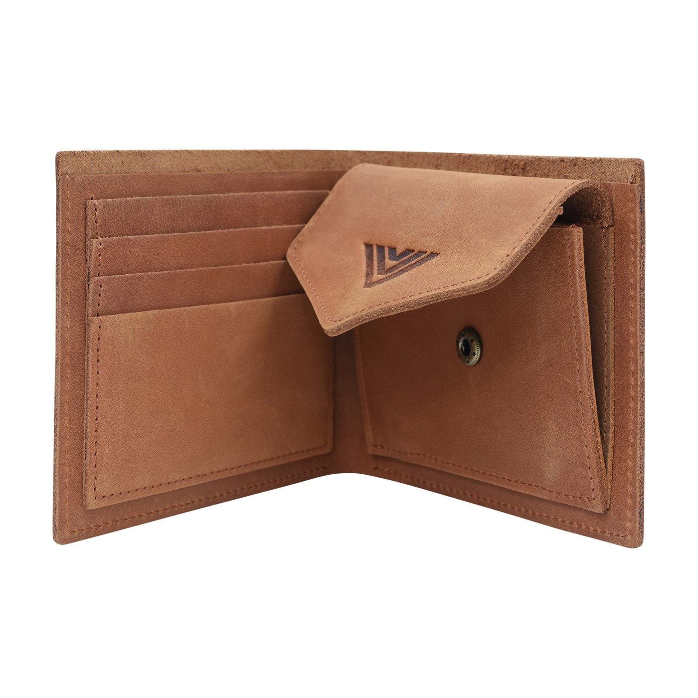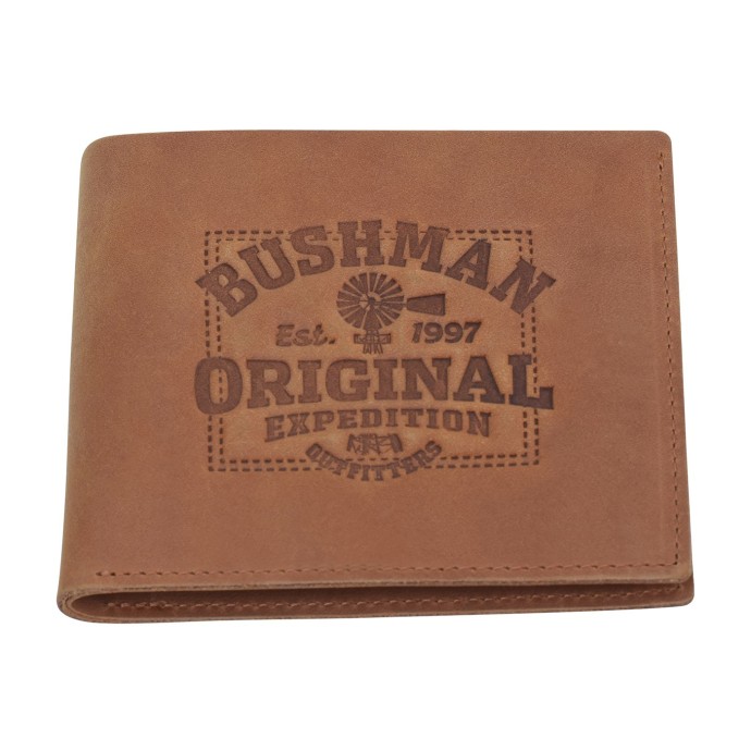 The YALA II cowhide leather wallet features card slots, a coin pocket with a snap closure embossed with the Bushman logo, and plenty of space for paper bills. The dominant feature is the dark embossed BUSHMAN est. 1997 Original Expedition Outfitters logo. It comes in a cotton drawstring bag. Dimensions: 11.5 × 9.5 × 2 cms.